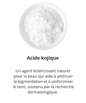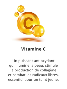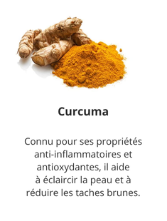 - Agents unifiants et anti-taches : Alpha-arbutine, curcuma, vitamine C.